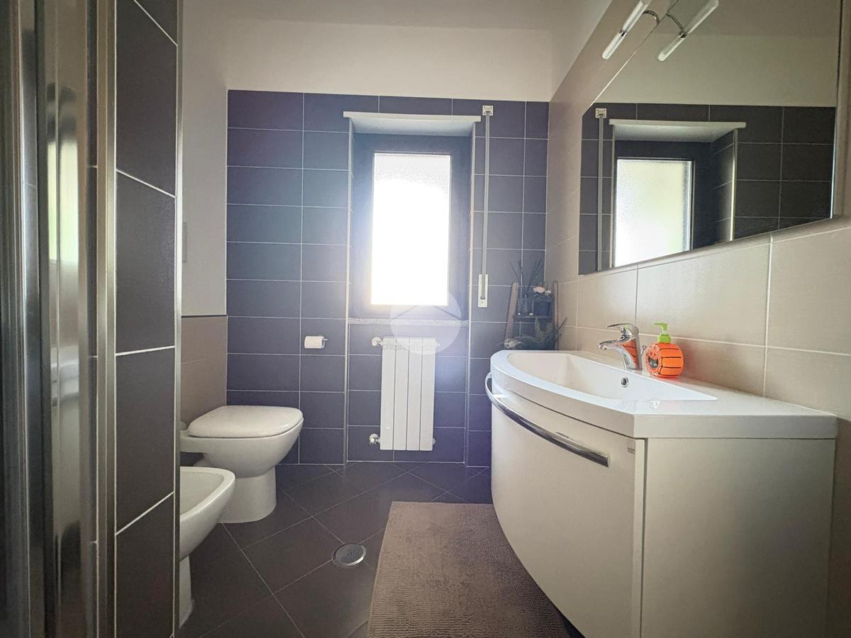Completa la zona giorno un bagno finestrato con vasca, arredato con lavabo Berloni e specchio con luci.